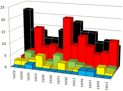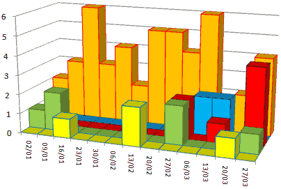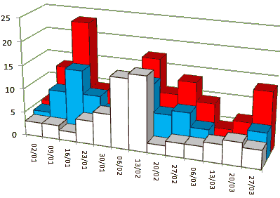 ![]() BBC1 BBC2 ITV1 Channel 4 five With less films for channels to choose from under the new scoring system, BBC2's devotion to some sort of entertaining programme content shows all the more. Channel 5 has only scored in two weeks so far this year, I1 and B1 in three weeks, and C4 in four weeks. Hidden behind C5, B2 took the week of 13th March off, though some B2 programming was watched on the iPlayer. Lets take a look now at what limited impact film has been having: