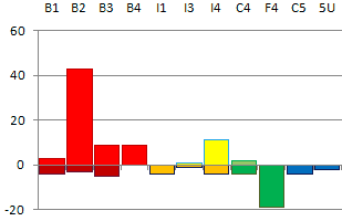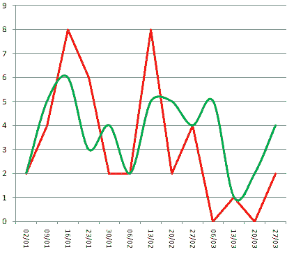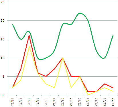 ![]() Broadcast TV Broadcast TV (excluding Film) On-Line TV The difference between broadcast and on-line radio is negligible: just a couple of points a week for the most part. The TV graph is more interesting (and looks a bit like Montenegro). That lump of internet fun in the middle is mostly, though by no means exclusively, down to me binging on See-Saw. Aside from that incident, at no point does the web get the upper hand on the mast whilever films are included in the score. Remove cinema and it's had a couple of weeks in March. Of course, all that really means is that I was having a more exciting social life in March, and had to watch everything on the iPlayer. Figure 1.3 - Network by network, week