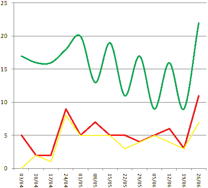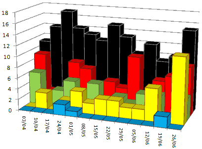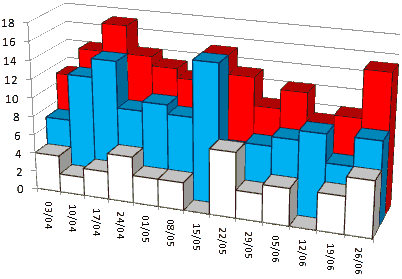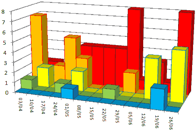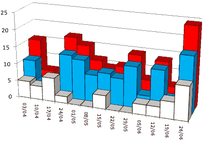 | JUNE Hello everybody. Sorry for the sudden disappearance. Margaret was playing up. Thankfully I'm back now, all bright-eyed and bushy-bearded. While I've been away we've had two world cups, Glee, Doctor Who, and a whole series of Dollhouse. I'll discuss these, and various other things as I sum up the quarter. I'll be doing that just the other side of this scorecard: |