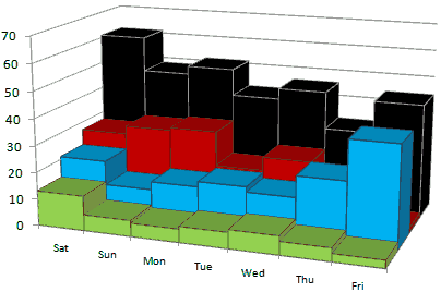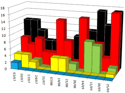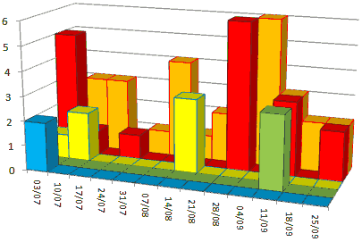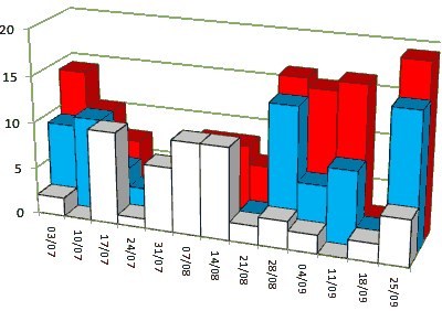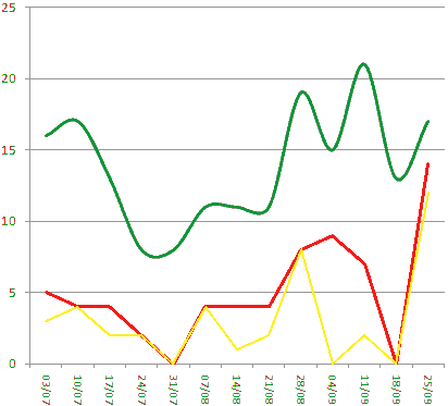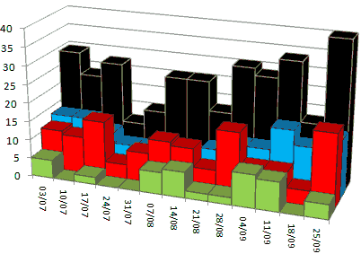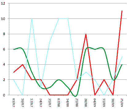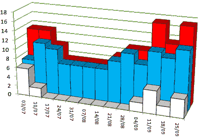 ![]() Overall TV Radio Film The "what day was I out" graph says that I was out on Thursdays but that I had my radio with me. Television's best day is Monday, with the best films being shown on Saturday (the best day to stay in). Radio's best day is television's worst. Ok. Another summer pissed over, let us examine the standings: