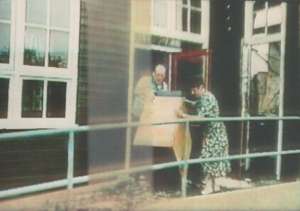 Mr Kirkpatrick and a woman (perhaps Mrs Cooke) drag out a cabinet (with