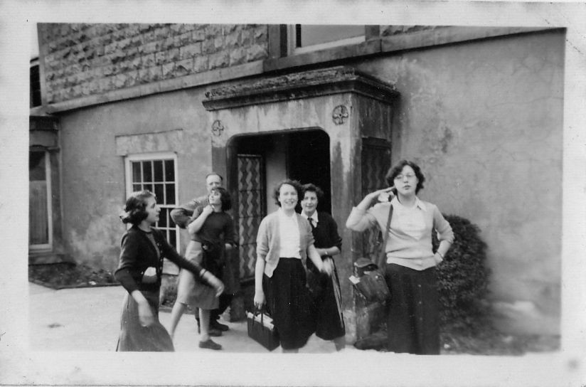 occupied by Lower School. He died on 20th February 1941, aged 65 years [RotherhamWeb]. The manor seems subsequently to have passed into the hands of the West Riding council, and from the turn of the 1950s it was used by both the Secondary Modern and the Secondary Tech as much-needed extra teaching space. A total of eleven classrooms were appropriated on the site. Elizabeth Pollard writes: "It was magical having this beautiful old house to study in. Mr. Burgess [seen in this staff photo] taught us music in the left hand room you can see in the photo [right]. The large tree on the right was a beautiful copper beech and in the back garden there was an ancient walnut tree. (The boys used to smear the girls with unripe nuts which left brown and indelible marks on the skin!) Mr. Lynch, the maintenance man, carefully controlled the glasshouse on the opposite side of the lane and grew grapes, peaches and many other exotics. In walking over from the main school we had to short circuit the sheep grazing in the paddocks! The adjacent farm was run by a local family I recall... Throapham really was a wonderful place and we were quite privileged to learn there. Mostly it was the arts classes, i.e. music, theology, geography, etc. that were held there, a somewhat muddy trip in winter and we had to change our shoes at the door." |